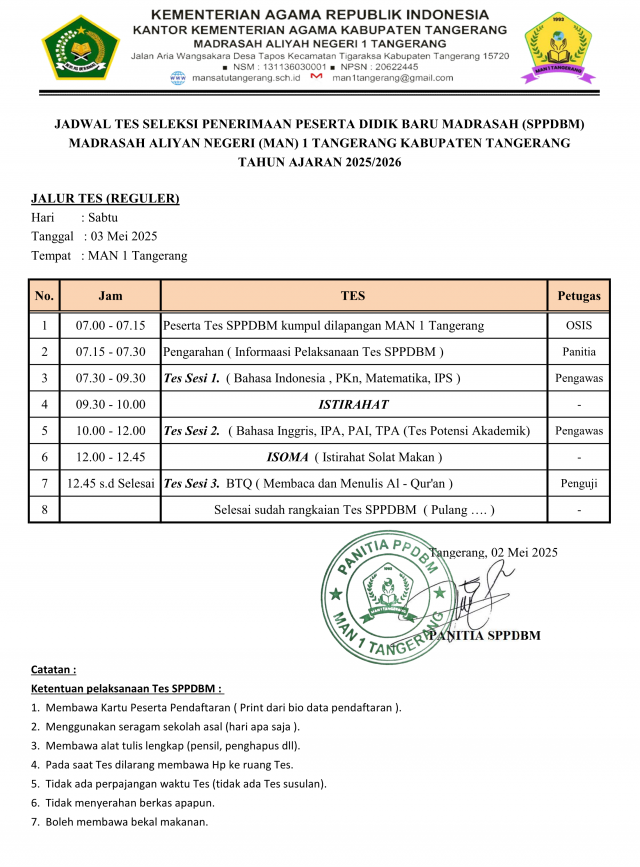 JADWAL TES SELEKSI PENERIMAAN PESERTA DIDIK BARU MADRASAH JALUR TES (REGULER) MAN 1 TANGERANG TAHUN AJARAN 2025/2026