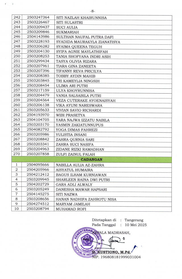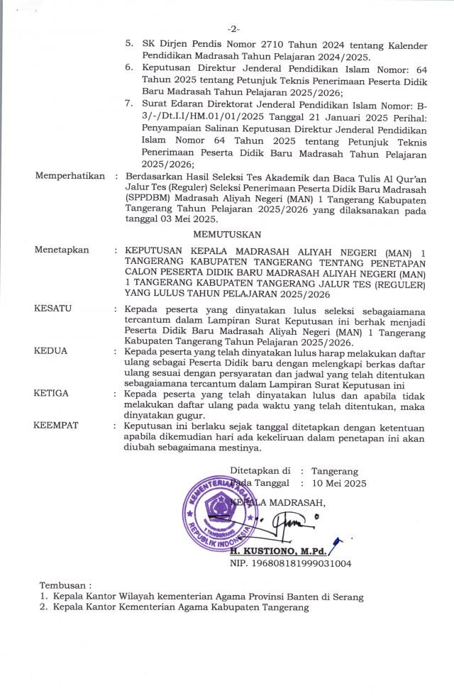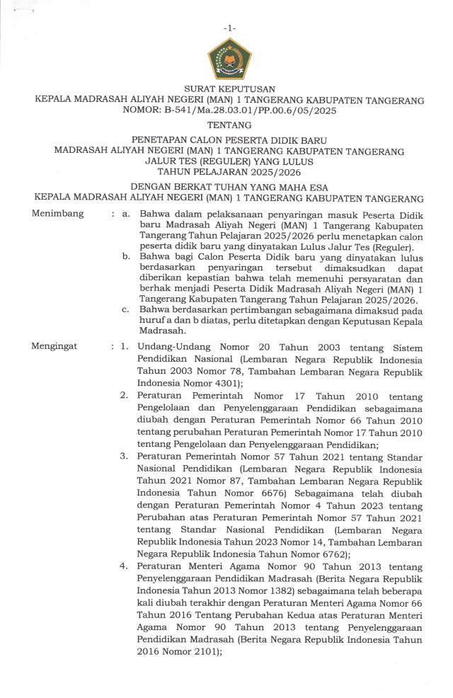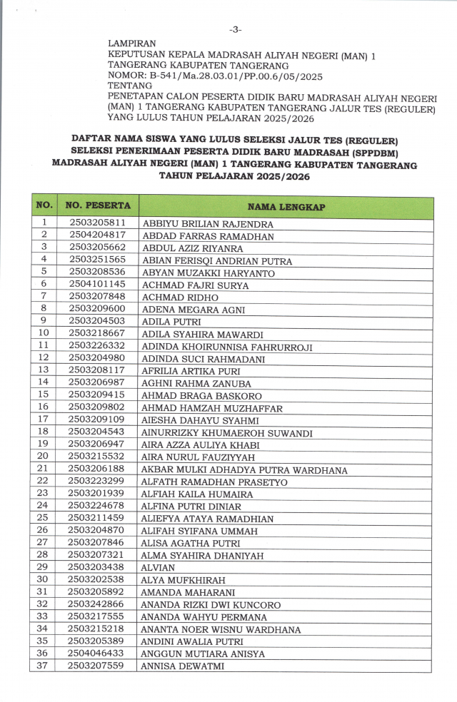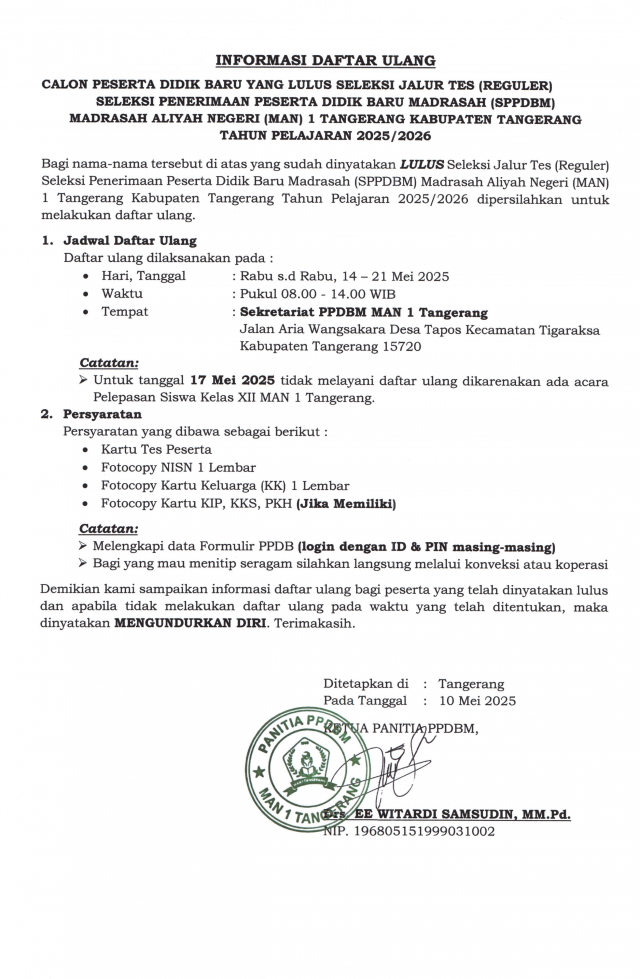 PENGUMUMAN HASIL KELULUSAN PPDBM MAN 1 TANGERANG KAB. TANGERANG JALUR TES (REGULER) TAHUN PELAJARAN 2025/2026