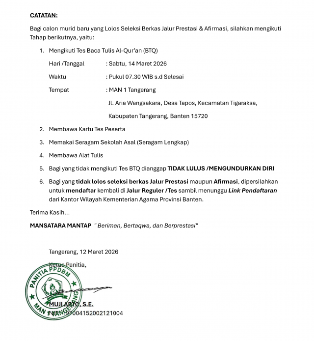 PENGUMUMAN LOLOS SELEKSI BERKAS JALUR PRESTASI & AFIRMASI PMBM MAN 1 TANGERANG TAHUN AJARAN 2026/2027