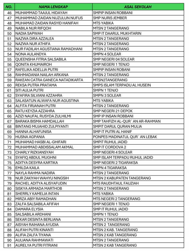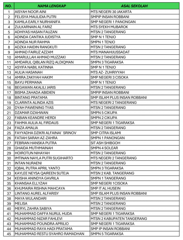 12/03/2026 | PendidikanBerikut Nama-Nama Peserta yang Lolos Seleksi Berkas Jalur Prestasi & Afirmasi Penerimaan Murid Baru Madrasah (PMBM) MAN 1 Tangerang Tahun Ajaran 2026/2027 sebagai berikut: