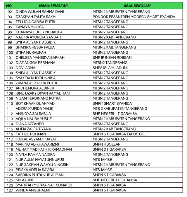 12/03/2026 | PendidikanBerikut Nama-Nama Peserta yang Lolos Seleksi Berkas Jalur Prestasi & Afirmasi Penerimaan Murid Baru Madrasah (PMBM) MAN 1 Tangerang Tahun Ajaran 2026/2027 sebagai berikut: